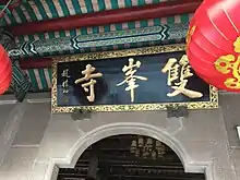 ![]() Under the eaves is a plaque with the Chinese characters "Shuangfeng Temple" written by the former Venerable Master of the Buddhist Association of China Zhao Puchu. | |