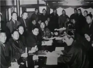 On January 6, 1932, the day after the banzuke was announced, several wrestlers of the Dewanoumi stable — 20 makuuchi, 11 jūryō and one makushita[5] went out to be treated to Chinese cuisine restaurant Shunjuen in Shinagawa, Tokyo, at the demand of sekiwake Tenryū who invited them.[3] At the banquet, Tenryū's delivered a speech advocating for a "reform of sumo society". They vowed to unite and locked themselves in the Shunjuen restaurant to gather their demands to the Association and issued a number of proclamations.[3]