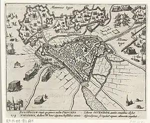 ![]() Map of the siege of 's-Hertogenbosch by Simon Frisius. | |||||||