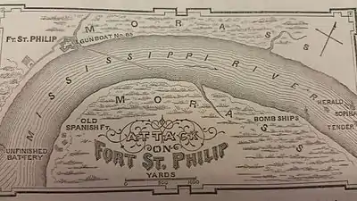 The incomplete battery opposite the fort was replaced with a larger structure, Fort Jackson. This and Fort St Philip were besieged in the American Civil War.[47]