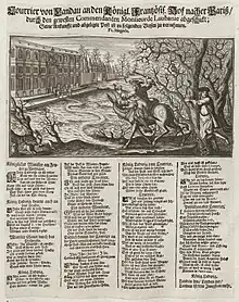 On 28 September, Joseph, King of the Romans, arrived and took nominal command of the siege. The rate of bombardment increased in October, while the defenders launched several sorties to disrupt the sappers. On 10 October, Laubanie was blinded during a bombardment, but remained in command. By November, the locks by which the defenders could control the flooding of certain ditches by the river Queich were destroyed and Marlborough had moved from his covering position to attack certain fortresses on the Moselle. On 23 November, following the loss of the covered way, Laubanie held a conference with his officers. The chamade was beaten and the garrison surrendered on 25 November.[12] The garrison marched out the next day.[13] The Imperial Army entered on 28 November.[12]