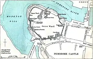 Kemeys was killed when Chepstow Castle was stormed on 25 May, and Powell was taken prisoner when he surrendered Tenby Castle to Horton on 31 May, but Pembroke Castle was a very strong medieval fortress which could not be taken as quickly. It stood on a rocky promontory surrounded on three sides by the sea, and on the landward side its defences consisted of a deep ditch and walls up to 20 feet (6.1 m) thick.