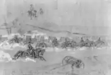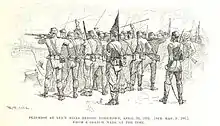 On April 4, 1862, the Union Army pushed through Magruder's initial line of defense but the following day encountered his more effective Warwick Line. The nature of the terrain made it difficult to determine the exact disposition of the Confederate forces. McClellan estimated that the Confederates had 15 to 18,000 troops in the defensive line.[8] Accounts by Magruder's soldiers indicate he marched his troops back and forth throughout his lines as a ruse to make his forces look stronger. "This morning we were called out by the 'Long roll' and have been traveling most of the day, seeming with no other view than to show ourselves to the enemy at as many different points of the line as possible," a Louisiana soldier recorded in his diary.[9] Magruder's own reports, however, do not mention this.[10] Word of Magruder's deception reached Richmond nevertheless, with Mary Chestnut noting in her diary, "It was a wonderful thing how he played his ten thousand before McClellan like fireflies and utterly deluded him..."[11] On 6–7 April, McClellan estimated (given Magruder's reinforcements) that 30,000 troops were at Yorktown.[12] Troops continued to arrive and on 20 April McClellan estimated "more than 80,000" were at Yorktown.[13]