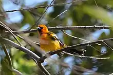 Native birds include a diverse mix of southern tropical dry forest and montane pine–oak forest species, including the red-tailed hawk (Buteo jamaicensis), common black hawk (Buteogallus anthracinus), ferruginous pygmy owl (Glaucidium brasilianum), Balsas screech owl (Megascops seductus), black-vented oriole (Icterus wagleri), hooded oriole (Icterus cucullatus), blue mockingbird (Melanotis caerulescens), military macaw (Ara militaris), rufous-backed thrush (Turdus rufopalliatus), pileated flycatcher (Xenotriccus mexicanus), banded quail (Philortyx fasciatus), grey-breasted woodpecker (Melanerpes hypopolius), black-chested sparrow (Peucaea humeralis), rusty-crowned ground sparrow (Melozone kieneri), happy wren (Pheugopedius felix), West Mexican chachalaca (Ortalis poliocephala), golden-cheeked woodpecker (Melanerpes chrysogenys), dusky hummingbird (Cynanthus sordidus), and Cabanis's seedeater (Amaurospiza concolor).[3][2][5] The Sierra is designated an important bird area, as it is home to both globally-threatened species and limited-range species.[5]