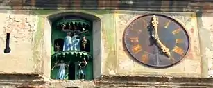 - The central position is dominated by a rotating platform in which are mounted seven wooden figures representing the days of the week, but only one of them can be seen from the Lower City through the right small window with ornamental wooden fretted. Every night at 12 o’clock, the round platform rotates from left to right a few degrees out of space on the old window and install the new day figure to be seen in the morning by the citizens.