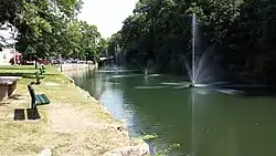 Siloam Springs City Park is a triangular city park in the center of Siloam Springs, Arkansas. Established c. 1897, it is bounded on the north by West University Street, the east by South Mount Olive Street, and roughly on the west by Sager Creek. The creek and two springs are the park's principal natural features; the springs are believed to be those that gave the city its name, and are now located in a sunken concrete basin with fieldstone walls. The park also has a c. 1897 Queen Anne style gazebo and a footbridge across the creek just above a low stone dam. The West University Street bridge, built in 1911, has distinctive handrails with embedded light fixtures.[2]