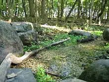 The park's name comes from a natural spring located along a trail on the south end of the park.[2] The spring's name is derived from the effect of sunlight on its surface, which makes the pool appear to shimmer like silver.[2] Even through the winter, the bubbling spring never freezes, and plants often poke through snow surrounding the watercress-bordered pool in the coldest months.[2][5] Three miles of the Fox River, which Silver Springs empties into, flows through the park's north end.[5]