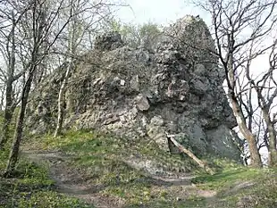 For his participation in the counterinsurgency, Szécsényi was made Master of the doorkeepers (thus also Marshal of the Royal Court), holding the office from 1403 to 1409 (there was a short interruption between July 1405 and January 1406, for unknown reasons).[14] Beside that he was also ispán of Sáros (1403–1405), Szepes (1404), Borsod (1404–1405) and Heves (1405) Counties.[15] Szécsényi was among the original founding members of the Order of the Dragon in 1408.[1] His brother Frank died in that year, thus Simon remained the sole head of the family. Feeling the nearness of his death, he concluded an inheritance contract with his nephew Ladislaus (II) in the presence of Judge royal Simon Rozgonyi on 9 December 1411 in Letkés. Accordingly, his son Nicholas would be the sole heir of Salgó Castle, which was acquired by Simon decades earlier, while Tapolcsány (today Topoľčany, Slovakia) belonged to Frank's branch. Hollókő and Ajnácskő (today Hajnáčka, Slovakia) were classified to Ladislaus (Frank's son) and Nicholas (Simon's son), respectively, while those accessaries (villages and lands) were shared between the two branches. The remaining two castles (Somoskő and Bene) and the surrounding villages became a joint family property, while both branches had to appoint an own castellan, simultaneously.[3] According to a charter dated 29 January 1412, Simon Szécsényi died around that time.[16]