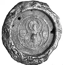In the upcoming years, the relationship increasingly worsened between the Hungarian barons (de facto led by Archbishop Kanizsai) and Sigismund, especially due to the latter's favoritism towards his foreign courtiers, such as Pipo of Ozora, Stibor of Stiboricz, Hermann II, Count of Celje and Bishop Eberhard Albeni. In 1401, Szécsényi participated in the magnate conspiracy against Sigismund. On 28 April, he led an armed group to the royal castle and demanded the "expulsion of Bohemians, Poles and other foreign courtiers". Sigismund refused the ultimatum and was thus captured and imprisoned in Visegrád, then Siklós. John Kanizsai as lord chancellor of the realm (corona regni) and the royal council took over the royal powers.[12] The council appointed Szécsényi as Voivode of Transylvania, depriving Stibor of his office.[13] The Garai family who kept the king under custody in Siklós, concluded a separate peace treaty with Sigismund, who was set free on 29 October 1401. The Kanizsais' victory proved to be pyrrhic and gradually lost their influence at the court. Szécsenyi, however, was able to retain his ascendancy due to his family relationship with the Garais through his marriage. The Siklós League, led by Nicholas II Garai (Szécsényi's brother-in-law) and Hermann of Celje, took the power over the royal court after the 1401 conspiracy.[1] Szécsényi was standing by the king in 1403, when another baronial revolt broke out in favour of Ladislaus of Naples.[1]