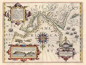 Simon de Cordes (born around 1559 – died 11 November 1599) was a Dutch merchant and explorer who after the death of Admiral Jacques Mahu, became leader of an expedition with the goal to achieve the Indies,[2] which was replaced for Chile, Peru and other kingdoms (in New Spain: Nueva Galicia; Captaincy General of Guatemala ; Nueva Vizcaya; New Kingdom of León and Santa Fe de Nuevo México).[3][4] The fleet's original mission was to sail along the west coast of South America, where they would sell their cargo for silver, gold or pearls and to head for Japan only if the first mission failed. In that case, they were supposed to obtain silver in Japan and to buy spices in the Moluccas, before heading back to Europe around Cape of Good Hope.[5] Their goal was to sail through the Strait of Magellan to get to their destiny, which scared many sailors because of the harsh weather conditions. The first major expedition around South America was organized by a voorcompagnie, the Magelhaen Company. It organized two fleets of five and four ships with 750 sailors and soldiers to "devaluate the Spanish".[6] It resulted in utter disaster, 80% of the men died during the journey and the investors made no profit. No full account of the voyage is in existence, but details can be gathered from an unofficial journal kept by Potgieter, a surgeon, letters from William Adams (pilot) and from the facts gleaned by Oliver Van Noort's squadron.[7]