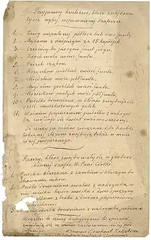 Teodor Narbutt, author of the nine-volume History of Lithuania, began corresponding with Daukantas in March 1842.[71] They exchanged books and materials. In total, Narbutt wrote 19 letters to Daukantas, and Daukantas wrote 20 letters to Narbutt.[72] Their main concern was to obtain and publish historical documents and other primary sources related to the history of Lithuania. Daukantas was particularly wary of falsified or altered sources being published by various Polish historians.[73] Their plan to publish primary sources was an intentional and principled decision to publish Lithuanian documents separately from Polish historians who began publishing Sources for the History of Poland (Źródła do dziejów Polski).[74] Daukantas sent to Narbutt about 800 copies[75] of various documents made during the years by himself or by Onacewicz,[76] including a copy of Die Littauischen Wegeberichte.[64] In particular, he highly valued a copy of a manuscript by Albert Wijuk Kojałowicz that cataloged and described various coat of arms of Lithuanian nobility. When Narbutt promised to find a way to publish the manuscript, Daukantas lent him the copy for a few months with strict orders to supervise the publication so that no Polish publishers could make any changes or alterations to the original text.[77] Narbutt harbored plans to publish the Bychowiec Chronicle as the first volume of a series of primary source publications, but Daukantas lost his patience after receiving only promises of ever grander plans.[78] Their collaboration broke down in 1844.[72] Narbutt never published or returned the documents received from Daukantas who was angry over losing most valuable pieces of his collection and continued to demand their return until 1858.[79] After Narbutt's death, his sons gifted some of the primary sources collected by their father, including 158 pages copied by Daukantas, to a library in Lviv (present-day Stefanyk National Science Library).[80]
