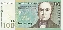 100 litai banknote, released in 2000, featuring Daukantas (obverse) and Vilnius University (reverse)
