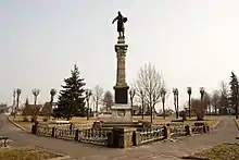 Around summer 1859, Daukantas left Jaunsvirlauka and briefly lived with various friends and relatives.[98] In October 1861, he moved to Papilė to live with Ignotas Vaišvila, a parish priest.[99] His health continued to deteriorate. Daukantas and Valančius exchanged final bitter letters in 1861, completely severing their friendship. One of these letters was later published in Aušra.[100] It is unclear what Daukantas did during the January Uprising of 1863–1864, but several of his friends were arrested, imprisoned, or exiled to Siberia. Vaišvila was arrested, but released.[101] Daukantas died on 6 December 1864 and was buried on the summit of the Papilė hill fort without much ceremony. Vaišvila put a simple engraved stone on the grave; twenty years later, he replaced it with an engraved ledger gravestone commissioned in Riga which survives to this day.[102] In 1925, Antanas Raudonis, a former Lithuanian book smuggler and an amateur sculptor, added a cross that is shaped as an oak stump with a growing shoot.[103]