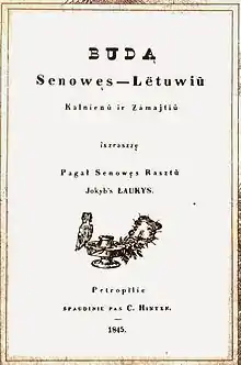 Daukantas was passionate about the Lithuanian language and its purity. He was concerned that religious books, by far the most popular Lithuanian books at the time, were often translated by foreigners with poor knowledge of Lithuanian. As such, prayer book language was full of loanwords and barbarisms from various Slavic languages.[175] Therefore, in 1843, he undertook to prepare a prayer book – a rare feat for a layperson – in correct Lithuanian. He took prayers from various popular books of the time and submitted his manuscript to bishop Szymon Mikołaj Giedroyć.[176] The manuscript received the approval from the diocese only in 1847, but for some unknown reason was not published.[177]