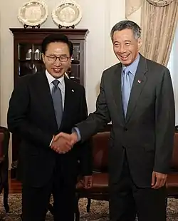 In 1971, South Korea and Singapore established consular relations by renaming the Korea Trade Centre to a consulate-general.[6] The two countries established formal diplomatic relations in 1975. In 1979, Lee Kuan Yew became the first Prime Minister of Singapore to visit South Korea.[7] The two countries started regular ministerial meetings in the same year.[8] In 1981, Chun Doo-hwan, the President of South Korea paid a state visit to Singapore, making him the first President of South Korea to do so.[9] In 2002, S. R. Nathan became the first President of Singapore to visit South Korea.[10]