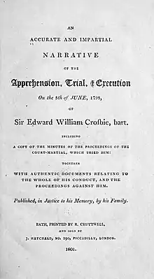 In 1802 Crosbie’s family and friends published their findings, once having finally obtained a copy of the minutes of the court-martial, and had completed their investigations. Every obstacle and obfuscation had been placed in their path in order to establish the truth. J.J. Woods gives a full account of the lengths the family went to, in order to privately publish their evidence of Crosbie's innocence. They entitled this: An Accurate and Impartial Narrative of the Apprehension, Trial & Execution, on the 5th of June, 1798 of Sir Edward William Crosbie, Bart.[4]