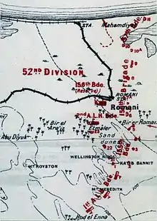 For the Battle of Romani, Chauvel chose his ground carefully, reconnoitring it from the ground and the air, and selecting both forward and fall back positions. His luck held; the German commander – Friedrich Kreß von Kressenstein – selected the same position as the forming up area for his attack in August 1916. Under great pressure, Chauvel maintained his position until Brigadier-General Edward Chaytor's New Zealand Mounted Rifles Brigade arrived after being released by Lawrence.[42] The counter-attack that Chauvel had been calling for all day did not materialise until dusk. At Katia and again at Bir el Abd, Chauvel attempted to sweep around the Turkish flank but wound up making frontal attacks on the Turkish rearguard and was beaten off by determined counter-attacks and artillery fire against the 3rd Light Horse Brigade.[43] Despite killing 1,250 Turks and taking over 4,000 prisoners,[44] Chauvel was criticised for his failure to rout and destroy the Turks.[45] However, for the Australian and New Zealand horsemen, who suffered over 900 of the 1,130 British casualties,[46] it was a clear-cut victory, their first decisive win and the turning point of the campaign. Later, Chauvel realised that Romani was the first decisive British victory of the war outside West Africa Campaign.[40]
