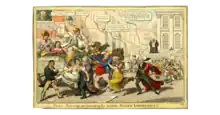 Wood was a prominent partisan and adviser of Queen Caroline on her return to England in 1820: she arrived at Dover on 5 June.[22] In 1813, when she was a beleaguered Princess of Wales, he had gone to Kensington Palace with an address from the City of London, and congratulated her "upon her triumph over a wicked conspiracy against her honour and her life".[1] Wood had carried out a protracted campaign to stage manage her return. An apparent attempt via his son William to contact her in Italy, near Parma, took place in 1819.[23] Wood was corresponding with her by April 1820, and his son John Page Wood met her in Geneva. Wood himself went to France at the end of May. At Saint-Omer, he frustrated the efforts of Henry Brougham, the Queen's attorney-general, and Lord Hutchinson, who were on a government-backed mission to buy her off. Wood convinced the Queen with promises of the popular acclaim that would greet her. They arrived in London on 6 June.[11] The diarist Charles Greville noted on 7 June: