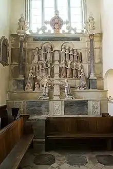 - ↑ The monument has four tiers, populated by effigies of 22 people, all members of the Hele family. On the lowest tier kneel Sir Thomas's two sons, facing each other over a prie-dieu. On the tier above lies the semi-recumbent figure of Sir Thomas Hele, dressed in full armour, excepting helm which rests by his shoulder. His two daughters kneel watching him in prayer, one at his head, the other at his feet. On the tier above him kneel a man and his wife, either side of a prie-dieu, the man on the left, his wife on the right. Behind the man are his five sons kneeling, behind the woman three daughters. On the top tier the arrangement is repeated, with two sons behind the man and four daughters behind the wife. The two uppermost tiers are thought to represent the family of sir Thomas's father and grandfather. On top of the monument is an escutcheon showing the arms of Hele (very worn). There is no inscription on the monument, but it is probable that the effigies represent Thomas Hele of Exeter, Thomas Hele of Fleet (his son), and his son Sir Thomas Hele who was the first baronet of the family. There is the Red hand of Ulster badge of a baronet in the arms which probably applies to Sir Thomas, the first baronet, but the style is earlier.