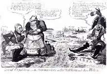 Sir William Curtis (centre) in an 1809 caricature on the Walcheren Expedition, between military commanders John Pitt, 2nd Earl of Chatham and Marshal Bernadotte