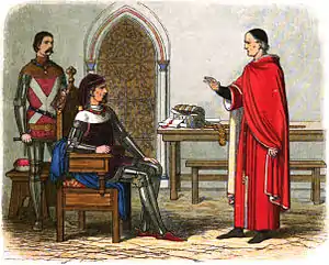 He is said to have studied at the University of Cambridge, but his name is not found in any university or college records.[2] According to Arthur Collins, Gascoigne was a law student at the Inner Temple.[3] It appears from the year-books that he practised as an advocate in the reigns of Edward III and Richard II. When Henry of Lancaster was banished by Richard II, Gascoigne was appointed one of his attorneys, and soon after Henry's accession to the throne was made chief justice of the court of King's Bench. After the suppression of the rising in the north in 1405, Henry eagerly pressed the chief justice to pronounce sentence upon Richard Scrope (Archbishop of York), and the Earl Marshal Thomas Mowbray, who had been implicated in the revolt. This he absolutely refused to do, asserting the right of the prisoners to be tried by their peers. Although both were later executed, Gascoigne had no part in this. This is Collins's account; but it has been doubted whether Gascoigne could have displayed such independence of action without prompt punishment or removal from office.[4]
