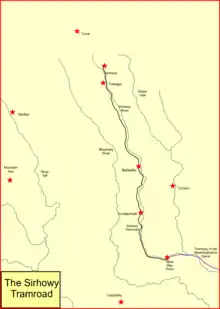 The Sirhowy Tramroad was a plateway built to convey the products of ironworks at Tredegar to Newport, South Wales. It opened in 1805 between Tredegar and Nine Mile Point, a location west of Risca, from where the Monmouthshire Canal Company operated a tramroad to Newport. The Sirhowy Tramroad was operated at first by horse traction, but early locomotives were used, and a passenger service was operated.