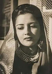 Her first trip to Europe was in 1934.[4] In London, an "onlooker" in the Daily Mail wrote that "Princess Karam is pale. In her own country she is considered the most beautiful of the Princesses; they call her the "Rose of India"."[4] That year Cathleen Mann's sketch of her was displayed at the New English Art Club show at the Suffolk Street Galleries.[5] Subsequently, in Paris, the media widely reported on her looks.[2][4] In 1938 her portrait featured in Oliver Messel's exhibition.[6]