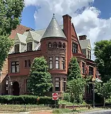 There were also smaller homes built around Scott Circle, including a Victorian building on the southwest corner rented by Alexander Graham Bell in 1883 which housed his Bell Experimental School.[16] A large home built south of Scott Circle in 1886 was for Lucius Tuckerman, whose Richardsonian Romanesque house on the southwest corner of 16th and I Streets was designed by Hornblower & Marshall.[16] North of Scott Circle larger homes built during this period include the Richardsonian Romanesque 1623 16th Street, built in 1886 and designed by Albert W. Fuller, and 1401 16th Street, a similar style house built in 1888 which later served as the residence of Vice President James S. Sherman.[14][17]