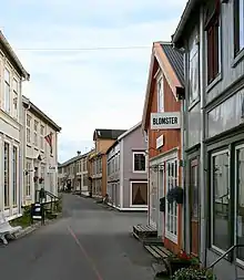 Sjøgata (Norwegian: Sea Street) is a historic and picturesque area running along the mouth of the river Vefsna in the town of Mosjøen which is located in Vefsn Municipality. It lies in the traditional district of Helgeland in Nordland county, Norway. Sjøgata, with the largest concentration of listed wooden buildings in northern Norway, is a popular tourist site. Sjøgata is an area of piers, storehouses, boathouses, a number of galleries and several restaurants, together with the Vefsn museum and Kulturverkstedet, a culture workshop with exhibitions. Sjøgata has been awarded the St. Olav Rose, the Norwegian Heritage Seal of Quality. Fru Haugans Hotel, located on the end of Sjøgata, is the oldest hotel in North Norway dating back to a former trading post established in 1794.[1]