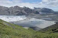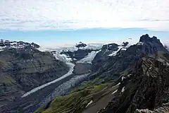 View from Kristínartindar mountain peaks towards Morsárjökull glacier.