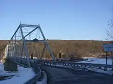 The Skinners Falls – Milanville Bridge is a bridge spanning the Delaware River between Milanville, Pennsylvania, and Cochecton, New York, in Wayne County, Pennsylvania, and Sullivan County, New York. The bridge is 470 feet (140 m) long and holds one single lane of Skinners Falls Road, a local road. The bridge was constructed by the American Bridge Company and funded by the Milanville Bridge Company. The bridge replaced a ferry run by raftsman Daniel Skinner and his family. The bridge opened in 1902 and remained in service up until recently. It is one of several bridges in Sullivan County that are on the National Register of Historic Places, including the Roebling Aqueduct and Pond Eddy Bridge. The bridge is located with the Milanville Historic District.