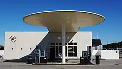The Skovshoved Petrol Station (Danish: Skovshoved Tankstation) is a historic, still-operating filling station in Skovshoved at the northern outskirts of Copenhagen, Denmark. First opened in 1936, it was designed by Arne Jacobsen and is an example of the functionalist style typical of the time. It is Class A listed and was thoroughly restored in 2002.[1] The filling station was originally commissioned by Texaco but is now operated by Uno-X.