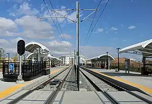 Sky Ridge station is a light rail station in Lone Tree, Colorado, part of the Regional Transportation District (RTD) system in the Denver metropolitan area. It is served by two lines: the E Line to Union Station and R Line to Aurora.[3] However, the R Line currently terminates at Lincoln station due to low ridership in this area of Lone Tree which is still under construction and amid generally lower ridership due to the impact of the COVID-19 pandemic on public transport.