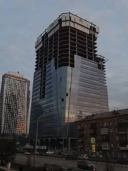 2 August 2015 KDD Group, building's developer, went bankrupt, being unable to pay all the debts to Ukreximbank.[9] For the rest of the year the work continued only on the facade and went very slow. 13 January 2016 the work on dismantling one of cranes began. By February both cranes were removed and the construction was put on hold.