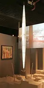 Both the name and form of the Skylon most likely referenced the Trylon feature of the 1939 New York World's Fair.[4] The name was suggested by Mrs A. G. S. Fidler, wife of the chief architect of the Crawley Development Corporation.[5] Moya wrote, "We were unimpressed at first but soon came to accept that, by combining the suggestions of Pylon, Sky and Nylon (a fascinating new material in 1951), it was wonderfully descriptive name which has lasted forty years, considerably longer than the structure itself."[6]