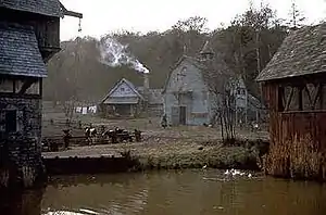 The original intention had been to shoot Sleepy Hollow predominantly on location with a $30 million budget.[25] Towns were scouted throughout Upstate New York along the Hudson Valley,[11] and the filmmakers decided on Tarrytown[17] for an October 1998 start date.[22] The Historic Hudson Valley organization assisted in scouting locations, which included the Philipsburg Manor House and forests in the Rockefeller State Park Preserve.[12] "They had a wonderful quality to them," production designer Rick Heinrichs reflected on the locations, "but it wasn't quite lending itself to the sort of expressionism that we were going for, which wanted to express the feeling of foreboding."[26] Disappointed, the filmmakers scouted locations in Sturbridge, Massachusetts, and considered using Dutch colonial villages and period town recreations in the Northeastern United States. When no suitable existing location could be found, coupled with a lack of readily available studio space in the New York area needed to house the production's large number of sets, producer Scott Rudin suggested the United Kingdom.[11]