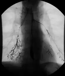 Various types of barium X-ray examinations are used to examine different parts of the gastrointestinal tract. These include barium swallow, barium meal, barium follow-through, and barium enema.[2] The barium swallow, barium meal, and barium follow-through are together also called an upper gastrointestinal series (or study), whereas the barium enema is called a lower gastrointestinal series (or study).[3] In upper gastrointestinal series examinations, the barium sulfate is mixed with water and swallowed orally, whereas in the lower gastrointestinal series (barium enema), the barium contrast agent is administered as an enema through a small tube inserted into the rectum.[2]