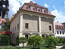 In 1777, with the assistance of the publisher Conrad Georg Walter, the theatre moved to a larger building in Borngasse (near the current location of the German Hygiene Museum), but after Walter's death the following year, it moved again on 7 December 1779 to its current home, a garden building in the courtyard behind the residence of the government secretary Johann Christoph Hoffmann at Hauptstraße 19.[5] This had been built in 1740 in Baroque style, intended for masquerades, but never used. It accommodated an audience of 250 and a 24-piece orchestra.[6] The 6 by 5 metres (20 ft × 16 ft) stage was small even then; it was illuminated with wax or tallow candles in special holders designed to reflect the light on the desired spot.[3] The interior was by Johann Ludwig Giesel, who also designed the interior of the original Gewandhaus in Leipzig. The design for the curtain in 1779 was by Johann Eleazar Zeissig, known as Schenau, a director of the Dresden Academy of Fine Arts; it depicted, amongst genii and garlands of roses, scenes from Greek mythology, such as Thalia, the muse of comedy, showing a youth the way to the temple of virtue while a bacchante tried to draw him towards the temple of lust.[6]