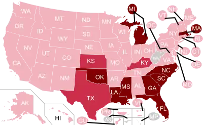 As of October 1, 2023, the following jurisdictions (12 US states) had statutes criminalizing consensual sodomy: Florida, Georgia, Kansas, Kentucky, Louisiana, Massachusetts, Michigan, Mississippi, North Carolina, Oklahoma, South Carolina, and Texas. These statutes penalties are not enforceable due to the binding precedent of Lawrence v. Texas, meaning consensual sodomy cannot be prosecuted.[26]