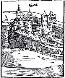 Sokograd was probably built at the end of the first half of the 13th century when the first stronger fortresses began to be built in the then Banate of Bosnia. During his attack on Bosnia, King Lajos I of Anjou tried to capture it in July 1363 but was prevented from doing so by the heroic defense of the city and they withdrew after three days of fighting. At the head of the defense was Knez Vukac Hrvatinić, father of more prominent Grand Duke of Bosnia, Hrvoje Vukčić Hrvatinić.[3] Knez Vukac, on these merits, received the Sokograd with entire župa of Pliva from Ban Tvrtko, and was bestowed with a title of duke. The Hungarians tried again to capture the city in 1405 but were defeated again. The King of Bosnia, Stephen Tomašević, spent a short time in the fortress during the period in which the Kingdom of Bosnia collapsed under the Ottoman invasion, after which it was recaptured by the Kingdom of Hungary. During the battles between the Ottomans and the Hungarians in the second half of the 15th and the beginning of the 16th century, Sokograd was part of the Hungarian Jajce Banovina up until 1518-1521.[4] The Ottomans finally occupied it in 1518,[5] or in 1521.[6] During the 16th century, it was mentioned as one of the 9 Vlach katun of Bosnia.[7] Sokograd served the Ottoman Empire until 1833 when it was abandoned by Ottoman Garrisons. The Fortress along with the rest of Bosnia was incorporated into the Austro-Hungarian Empire in 1878.[8]