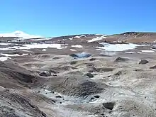 Sol de Mañana lies in the San Pablo de Lipez municipality (Sud Lipez Province),[2] in a remote and uninhabited region of Bolivia.[3] In an area of 10 square kilometres (3.9 sq mi)[4] there are steam vents, mud pools, hot springs, geysers and fumaroles.[5][4] Apart from Sol de Mañana proper there are additional geothermal manifestations dispersed a few kilometres south-southwest[6] at Apacheta[7] and 12 kilometres (7.5 mi) from Sol de Mañana;[4] north-northwest at Huayllajara;[7] The first two feature hydrothermally altered rocks[6] and sometimes they are considered to be separate geothermal fields.[8]