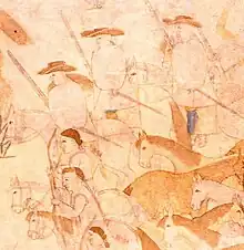 The soldados de cuera (English, "leather-jacket soldier")[1] served in the frontier garrisons of northern New Spain, the Presidios, from the late 16th to the early 19th century.[2] They were mounted and were an exclusive corps in the Spanish Empire. They took their name from the multi-layered deer-skin cloak they wore as protection against Indian arrows. When New Spain's visitador (inspector general) José de Gálvez organized the Portola Expedition, he was accompanied by a party of 25 soldiers, the "finest horsemen in the world, and among these soldiers who best earn their bread from the august monarch whom they serve".[1]