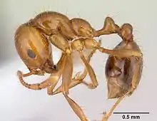 S. saevissima belongs to the Solenopsis saevissima species group which includes 13 fire ant species that exhibit remarkably similar morphology, rendering morphological distinction nearly impossible[3] without the aid of chemical characters.[14] S. saevissima has polymorphic adult workers that differ in size depending on their castes: minor workers are generally smaller and major workers are relatively larger. The major workers also typically have trapezoidal heads and antennal scapes almost reaching their vertex; the minor workers have ovate heads and antennal scapes that extend past their heads.