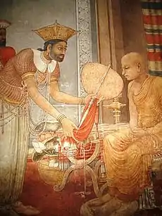 A native of Mahawewa, Madampe in Sri Lanka, second of seven boys in the family, Mendis was intended by his parents to become an Ayurveda Physician, but he was drawn to art.[1] In his early years, he worked and trained alongside his uncle Memonis Silva, himself a master painter.[1][3] Once accomplished himself, he began painting murals in Buddhist temples.[1] Later such as Rannasgalla Vihara and Maddepola Vihara.The Buddhist monks and devotees who saw magnificent style decided to call him to paint in Kelani Vihara. In order to increase his skills Mendis visited India to examine the works of Ajanta Caves, Ellora Caves, Bagh Caves and Sarnath, which inspired him to mingle the techniques of Indian Buddhist art with the traditions of Sinhalese classical art, eschewing the then prevalent European traditions.[4][5] At around the age of 30, he undertook a twenty-year project to complete the Kelaniya Vihara murals. His style was unique, from graceful brush strokes to perspective.