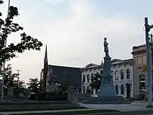 The Soldier's Monument in Somerset, Pennsylvania, pictured in the foreground with Somerset Anglican Fellowship (formerly St. Paul's Presbyterian Church) in the background.