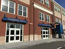In September 2014, students returned to a brand new, $82.3 million building, constructed immediately adjacent to the old facility.[15] The new "state of the art" building features a modern two-story library with oak paneling, a 70-seat lecture hall with internet and camera outlets, and an 800-seat double-tiered auditorium with a sound system.[16] The cafeteria opens to a concrete patio for eating outdoors.[16] The gym seats 3,200 and has a walnut floor with a four-layer cushioning, and includes hydraulic lifts to move heavy gym mats.[16]