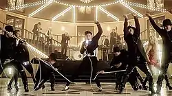 A teaser trailer was released on December 26, 2013, the day of TVXQ's tenth anniversary.[6] The sixteen-second teaser showed various snippets from the actual music video, which ended with words that read "10th Anniversary Something". The full music video premiered on TVXQ's official video-sharing channels on January 1, 2014, at 6pm KST.[22] The video, filmed sometime in early December 2013 in Paju, took three days to shoot. It features a big band ensemble with TVXQ dancing in two different studio settings a brightly lit opera house set and an alleyway. The outfits worn in the video include flowery and pinstriped cutaway tailcoats, wide-legged trousers, and other roaring twenties-driven pieces, some which were by Ann Demeulemeester from the spring 2014 collection.[23] The duo closely worked with choreographer Tony Testa and performance director Hwang Sang-hoon for the song's dance choreography.[24] Inspired by the project's period setting, they added microphones in their choreography and used them as ropes. The dance has three main points (highlights): the bass guitar strumming, the boxing ring, and the marionette dance.[25] The duo had described the dance as "extremely difficult; defying the laws of gravity".[5] The highly interactive dance choreography features both male and female dancers. Drawing inspirations from swing, Charleston and modern jazz dance, it also features many inversions and sliding movements.