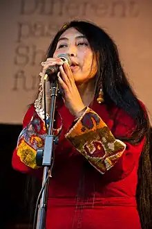 Soname Yangchen was born in the Yarlung Valley at the time of the Cultural Revolution in Tibet, into a noble family which was poorly regarded by the Chinese government. As a child, she was passionate for singing, and was sent to live for 7 years with her aunt in Lhasa. At the age of 16, she left Lhasa and crossed the Himalayas by foot to reach India. Her singing talents were "discovered" during a spontaneous performance at a friend's wedding, and she started singing professionally in England, becoming known worldwide, touring Europe, appearing at festivals in Australia and other places. She began by interpreting the traditional songs of her grandmother, and then songs of her composition. As of 2014, she has published two books. In 2003, she gave a gala at the Royal Opera in London.[1] In September 2004 she performed Tibetan folk and spiritual songs at a world music concert at LSO St Luke's, London.