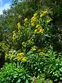 Tall shrub up to 2 m. Leaves pinnatisect with 10-15 pairs of equally spaced lobes, the lobes 6–40 mm wide. Inflorescence very large and dense, compound-corymbose. Individual heads with 30-50 yellow ray florets but no disc florets.