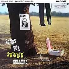 Songs for Swingin' Sellers was released on 4 December 1959 in a sleeve depicting "the booted and spurred feet of a man, presumably the artist, hanging from a tree above one of those record players that the adventurous might take on a picnic".[7] The artwork appears in Barry Miles, Grant Scott and Johnny Morgan's book The Greatest Album Covers of All Time, in which it is speculated that the shot of a hanged man may have been inspired by "Mort Sahl's brand of 'sick humour'".[38] In addition, the packaging carries several humorous notes, including instructions to "only use needles of Burmese plywood" to play the record and to "send Grandma out of the room".[7][23]